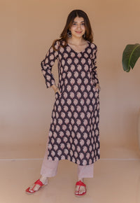 Cream Ajrakh Handblock Printed Cotton Straight Kurta.