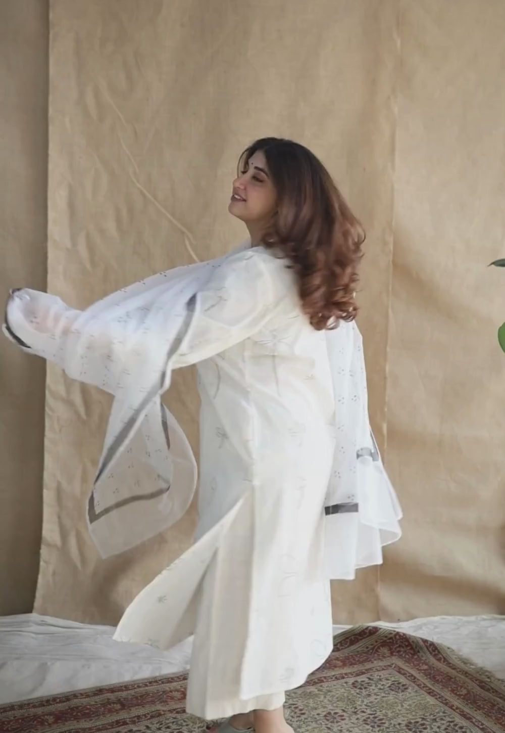 Natural White Dabu Handblock Printed Slub Cotton Kurta with Hand Embroidery Details.