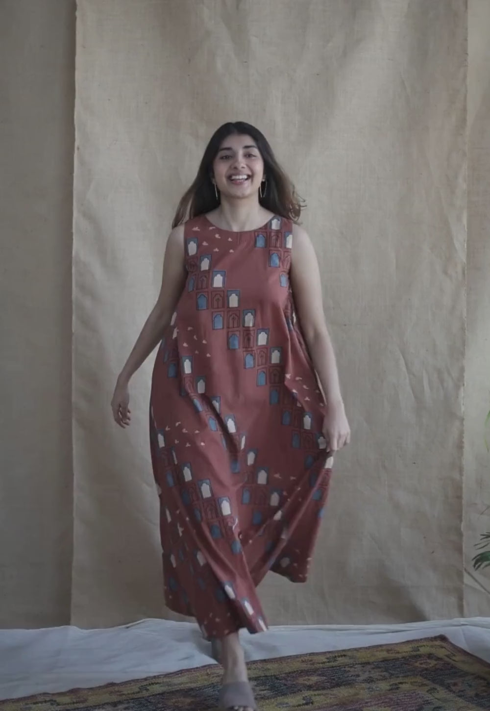 Jaipur Jharoka Brick Red Ajrakh Cotton A Line Dress