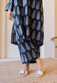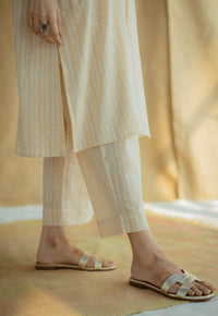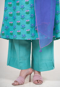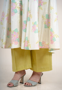 Lime Green Handblock Printed Slub Cotton Straight Pant.