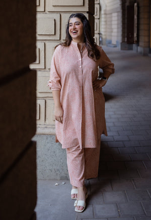 Peach Handblock Printed Slub Cotton Straight Pant.